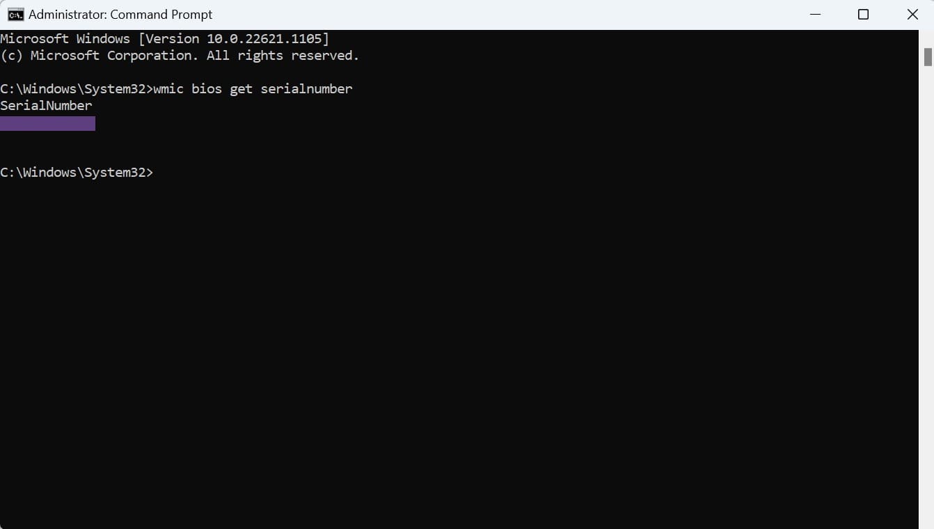 - Type “wmic bios get serialnumber” into the terminal and press Enter.