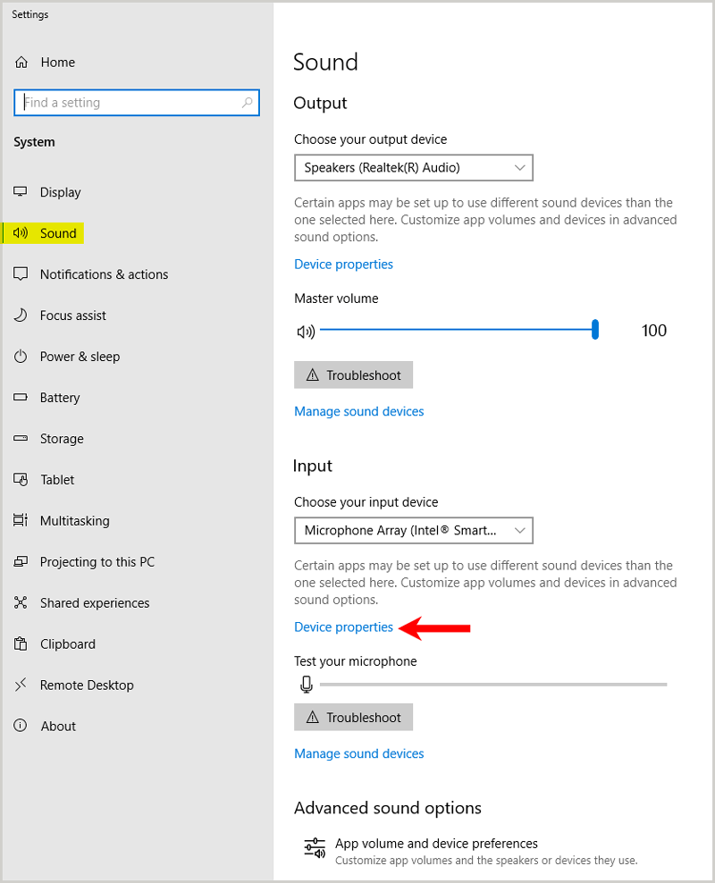 Open the Device Properties page; find the Manage sound devices option and click on it. This action will open up a screen listing all output and input devices.