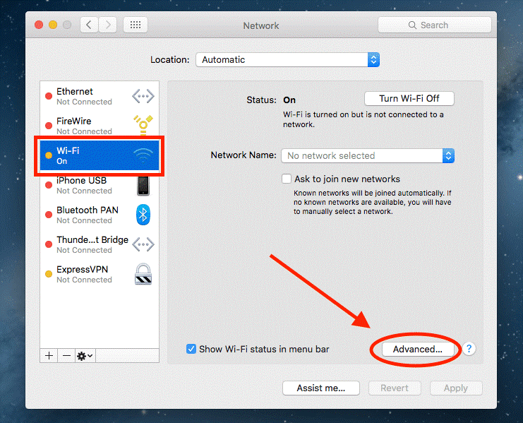 If you’re using a MAC laptop, we’ve got you covered. Finding this address on a MAC book is similar to using the taskbar on Windows 10. On your taskbar, click on the wireless networks icon and then open** Network Preferences** and then Advanced.