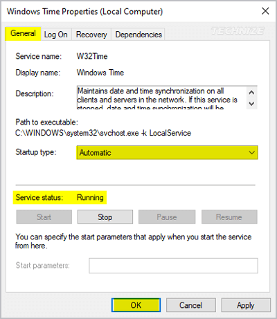 Step 3: Now, if your laptop is displaying the incorrect time, you will see that the service status is set to Stopped. If so, you will see a Start button below this. Click on the button to restart the Windows time service. Again, there will be a few pop-ups, just click OK or Apply to proceed.
