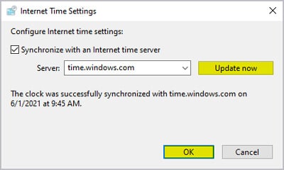 Step 3: Another pop-up box that reads Internet Time Settings will appear. Select the appropriate server from the drop-down list (by default, there will be a server named time.windows.com). After selecting your preferred time zone from the list, your laptop will automatically be updated with the new time and date.
