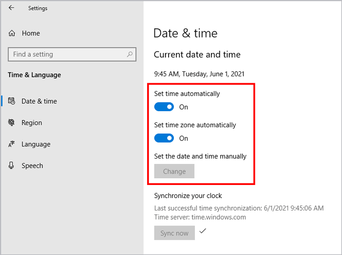 (Note: There is another option: Set time zone automatically. You can also toggle its switch, in which case, the time and date will be synced according to your time zone.)