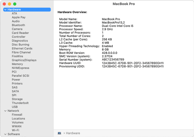You can launch the System Information app from the About This Mac window by clicking System Report, or from the Utilities folder in the Finder. When you open it, you’ll see your MacBook’s hardware Overview. Copy the serial number and follow the procedure described above.