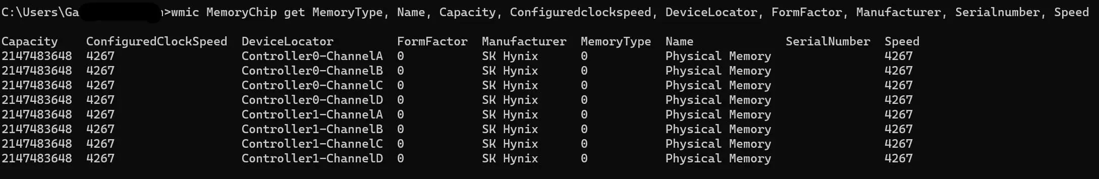 wmic MemoryChip get MemoryType, Name, Capacity, Configuredclockspeed, DeviceLocator, FormFactor, Manufacturer, Serialnumber, Speed