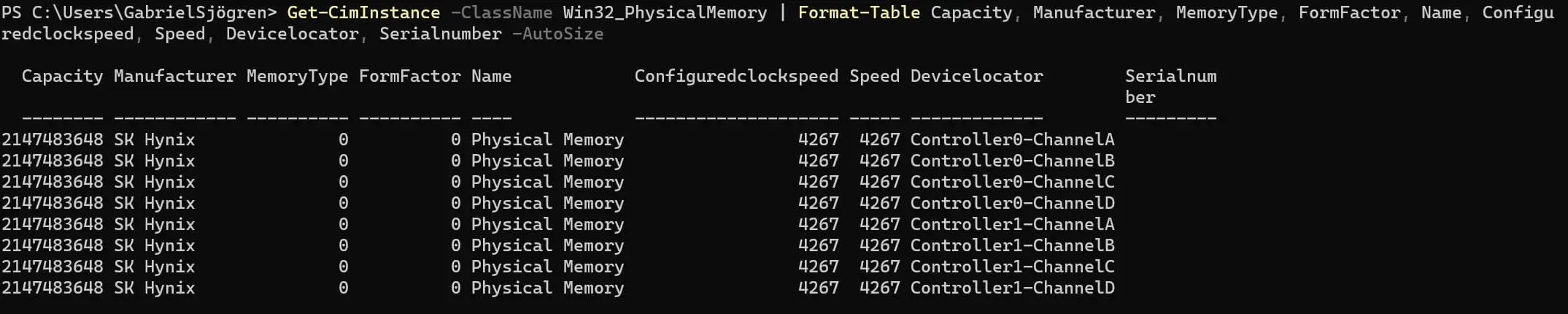 Get-CimInstance -ClassName Win32_PhysicalMemory | Format-Table Capacity, Manufacturer, MemoryType, FormFactor, Name, Configuredclockspeed, Speed, Devicelocator, Serialnumber -AutoSize