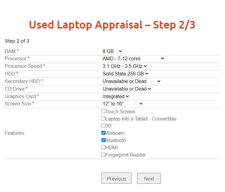 - In the next step, enter a more detailed status of the laptop configuration. Click on the** dropdown boxes** and choose the option that best fits your laptop. Also check the boxes with the features your laptop has.