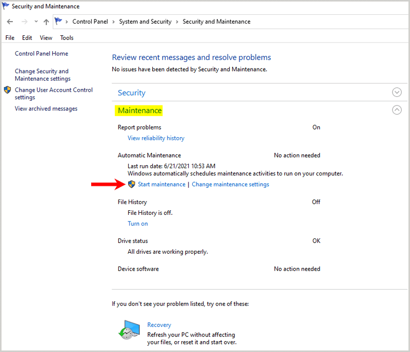 Step 3: Click on** Control Panel > System and Security > Security and Maintenance > Start Maintenance**