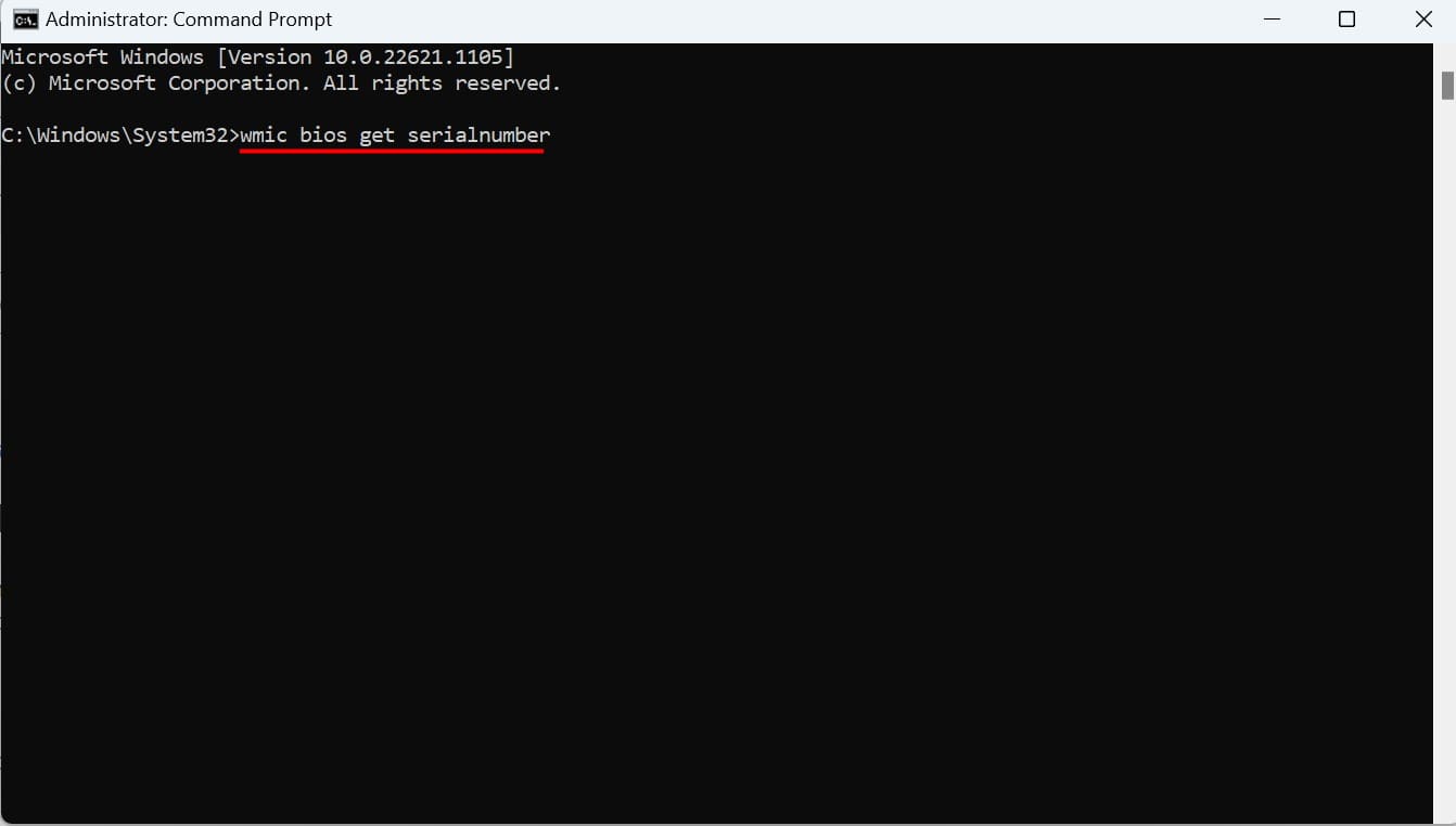 - Type “wmic bios get serialnumber” into the terminal and press Enter.