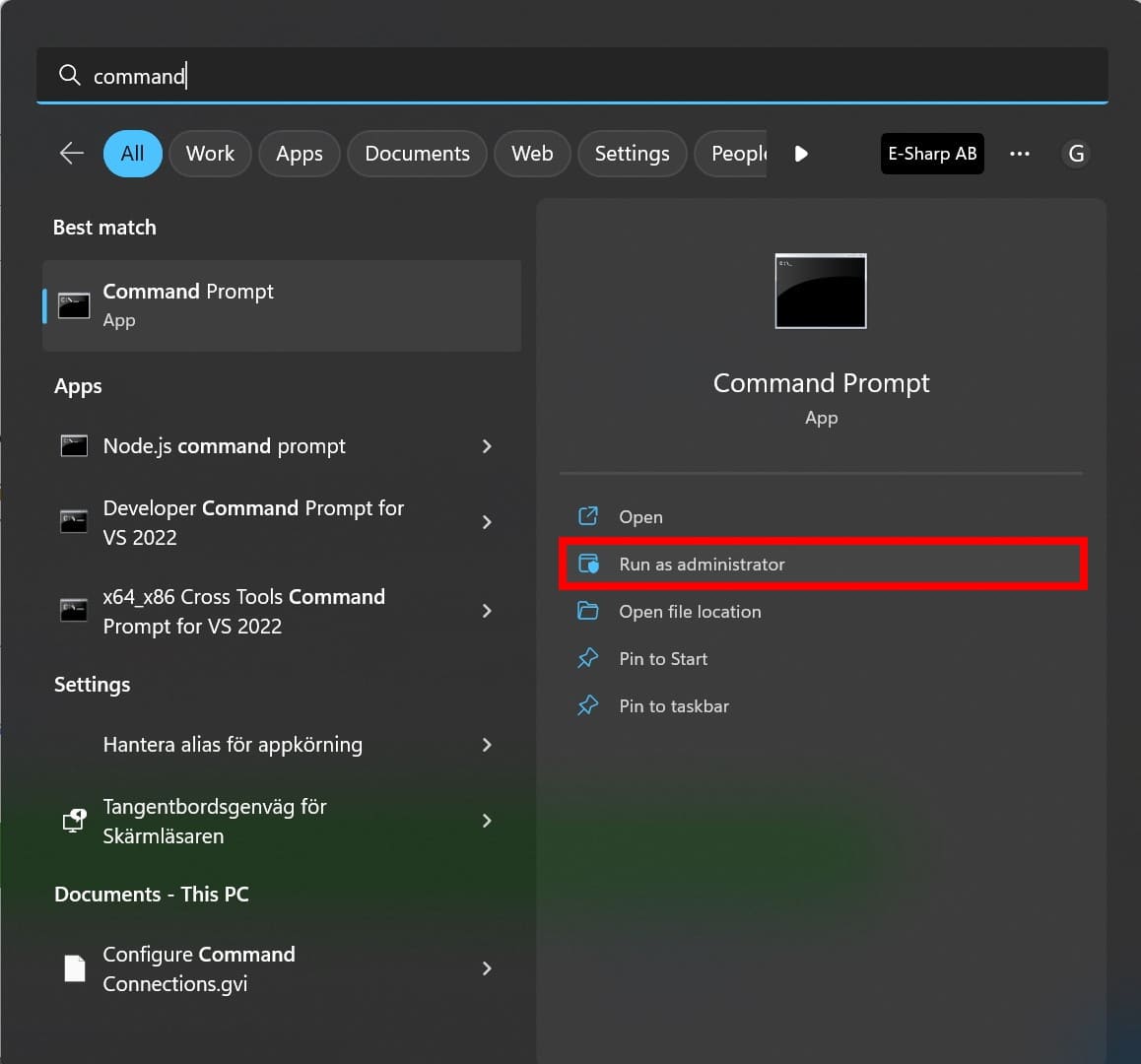 - Open the Windows Terminal by searching for Command Prompt in the search bar. Right click on the icon and select “Run as administrator”, as we need more rights than the normal user.