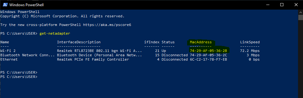 Here you open Windows PowerShell the same way you opened the command prompt using the search box on the taskbar. Then type the following command get-netadapter and click enter. You will get a set of all the network connections on your laptop. Look for MAC Address in the first row.