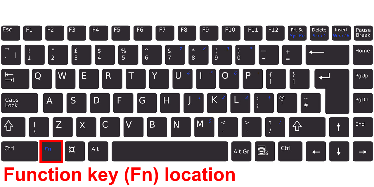The first thing you need to do is find out where your function key is located. On laptops, you can usually find the key in the bottom row of keys on your keyboard between the Ctrl key and the Windows key. It is usually abbreviated as Fn. The following picture shows where the fn key usually is located.