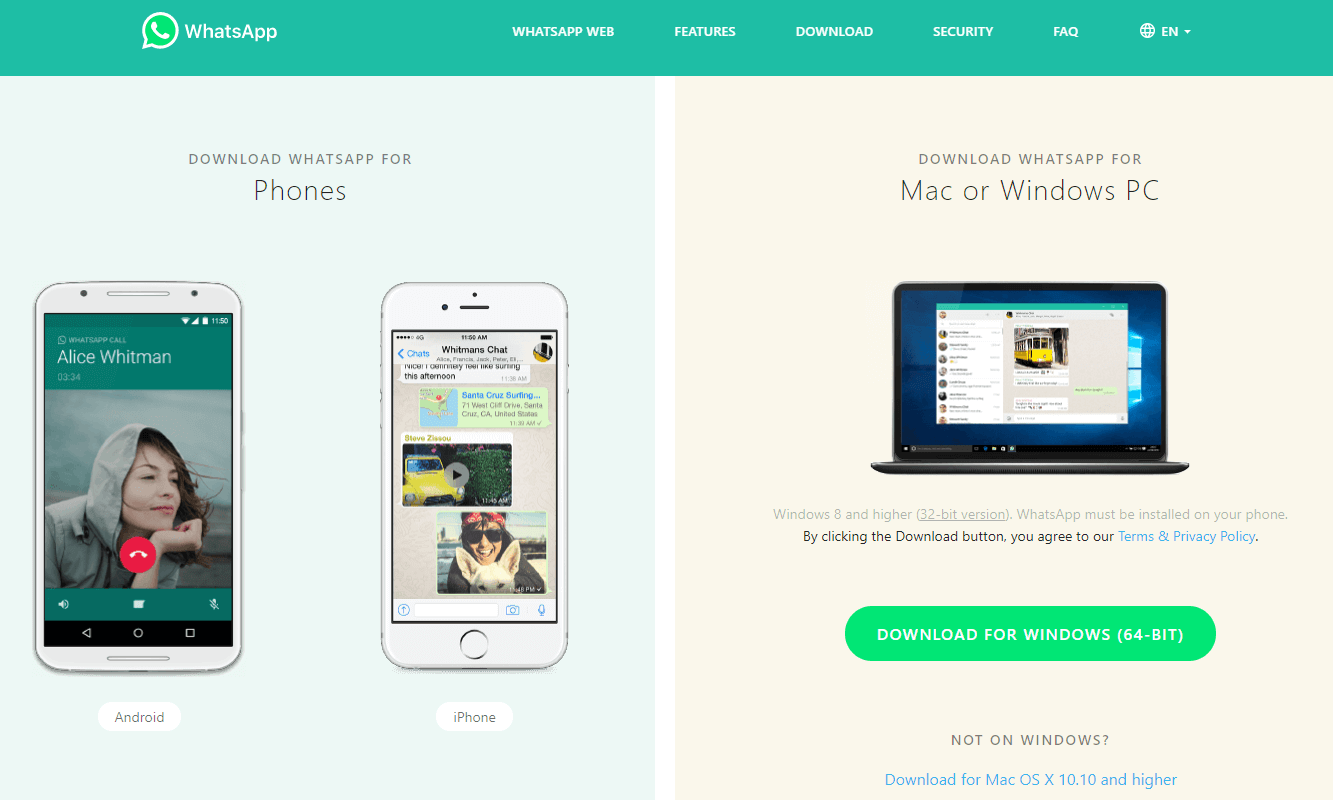 First you will need to download the WhatsApp PC client. There is a 64 bit and 32 bit version of the client available for Windows 8 and 10 users, so you need to choose the right one to download.