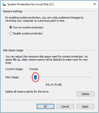 ③ You can see the current space used for system protection. Move the button on** Max Usage **leftward or rightward to change the Max Usage.